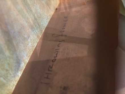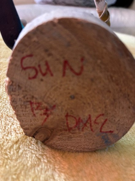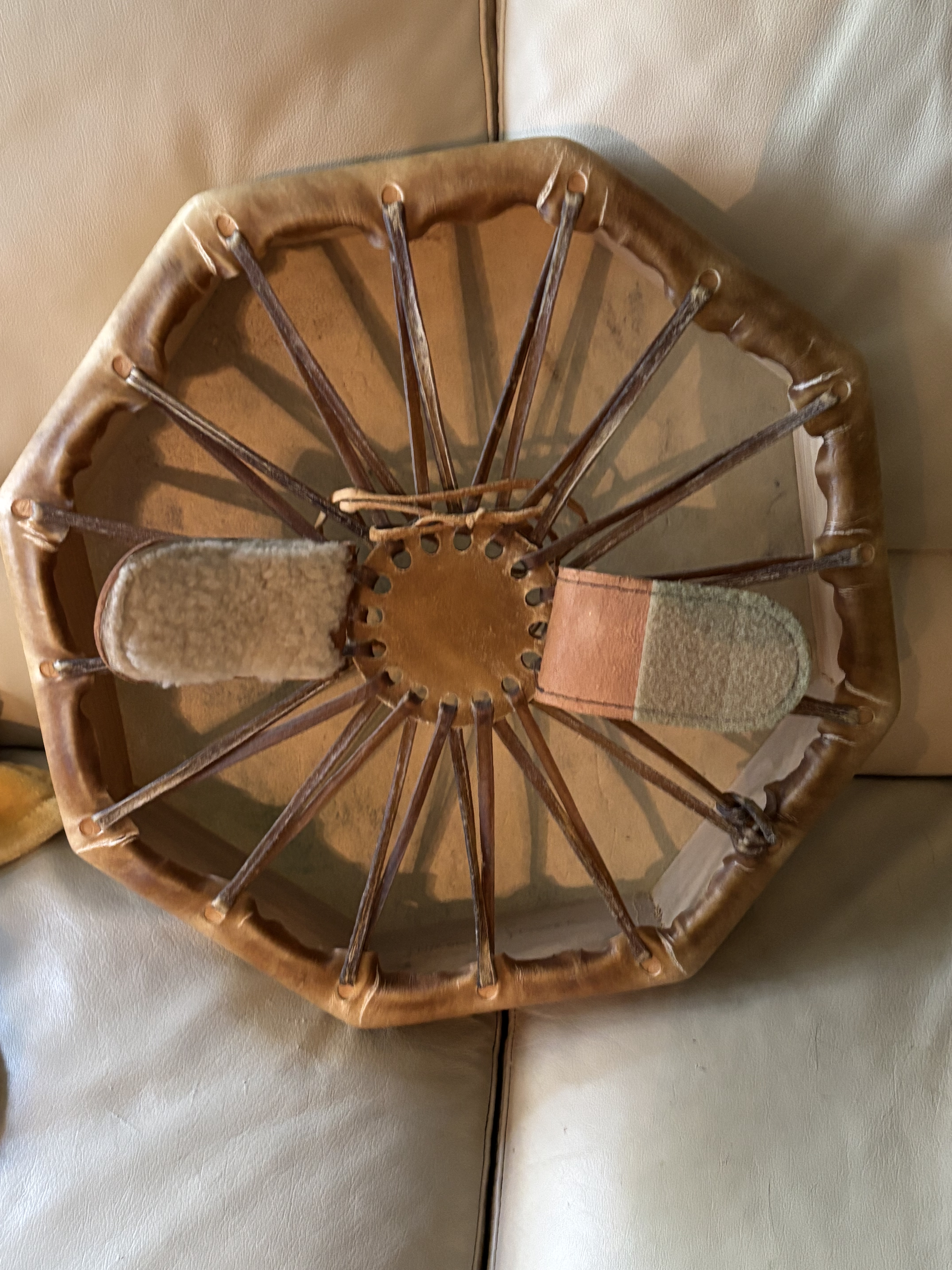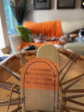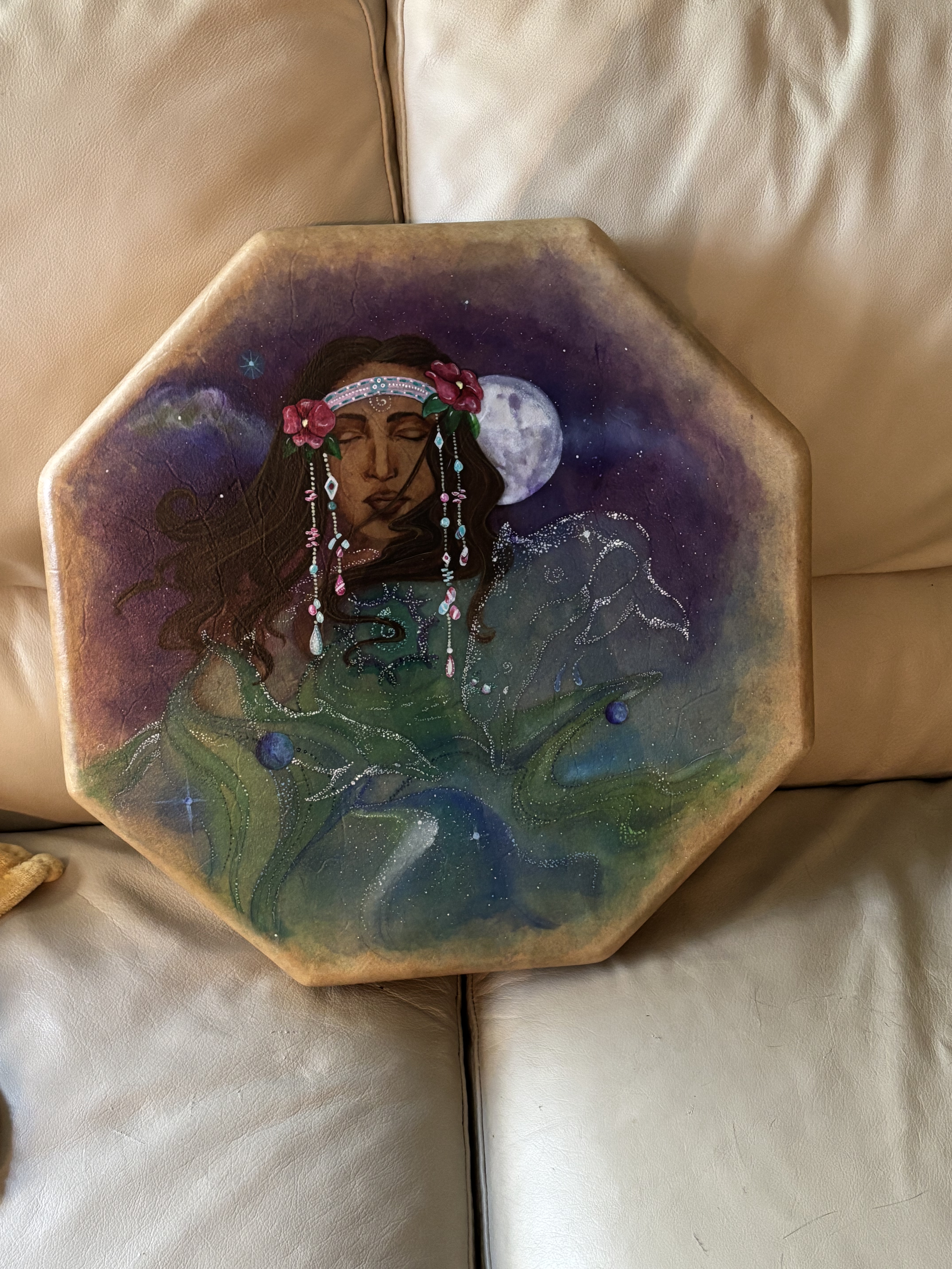 Artist: Throwing Flower. Pre-owned, painted lady in blues. Octagon, 16” x 16” 1991 Taos, New Mexico ALL IN ONE TRIBE U.S. Patent #D347, 852