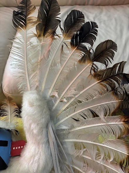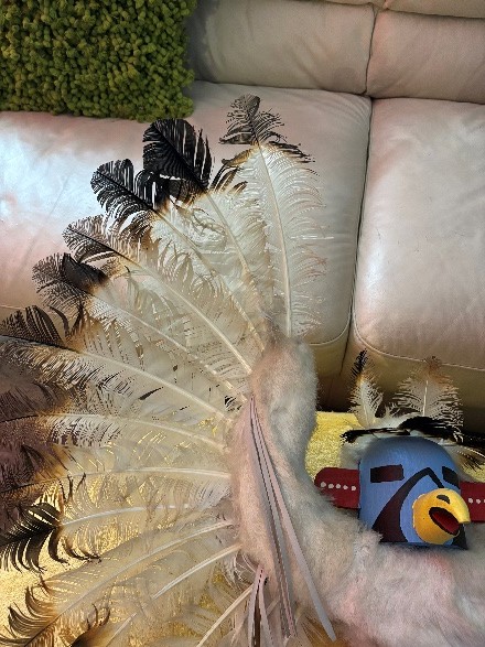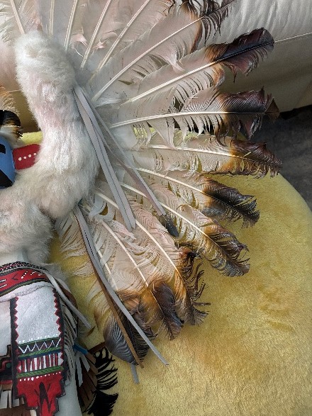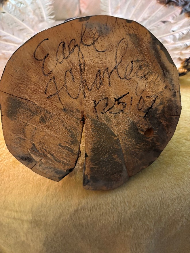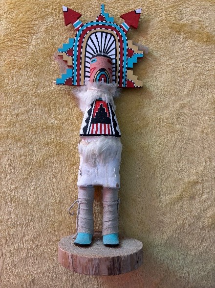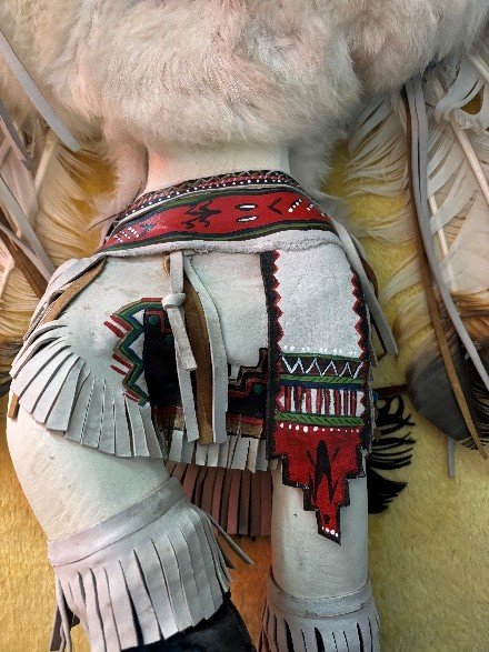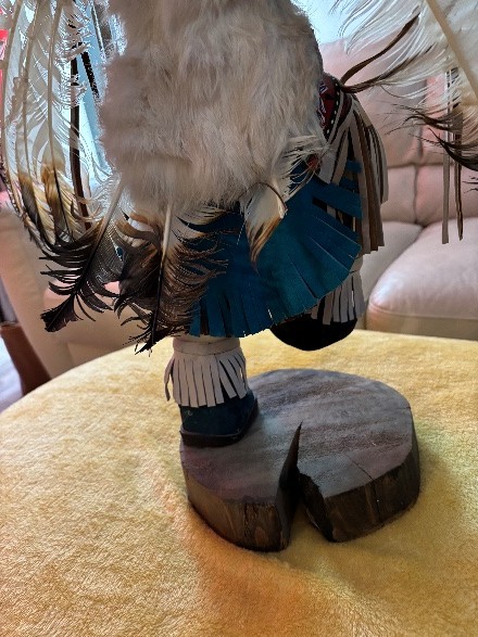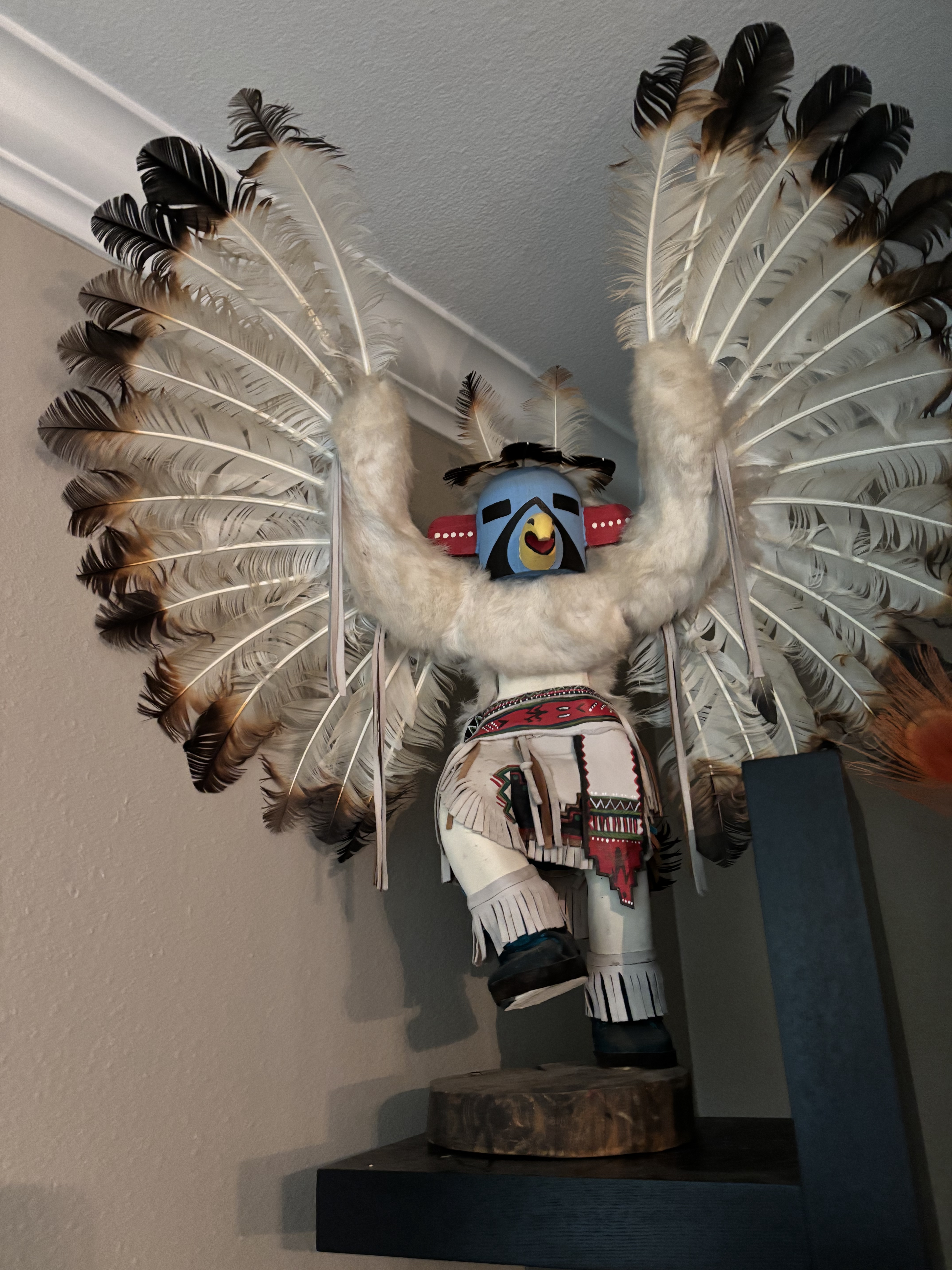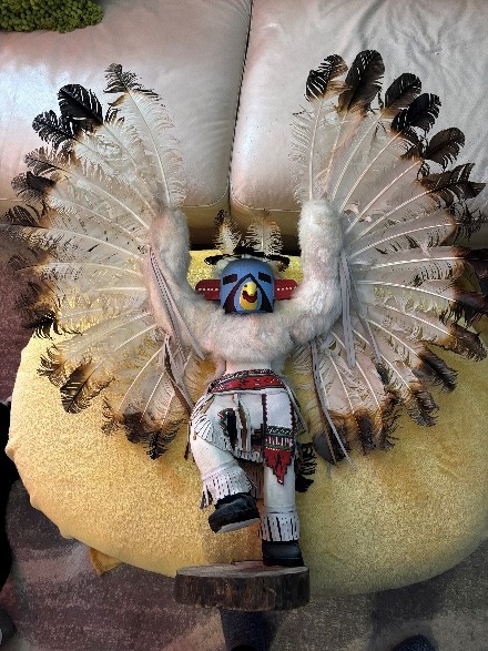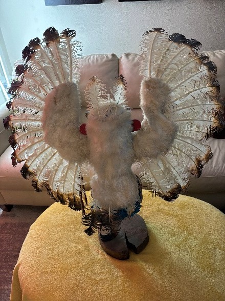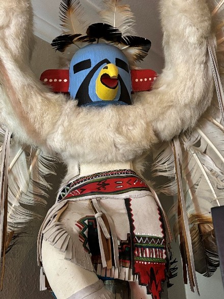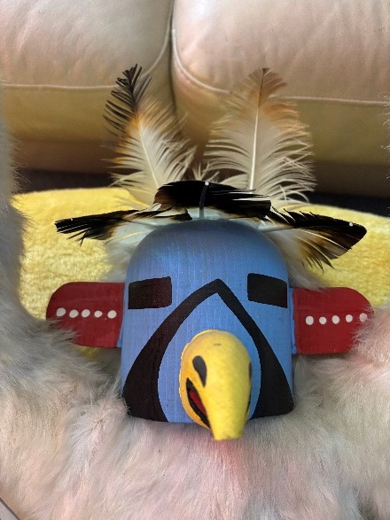 Alaskan Kachina Doll, AUTHENTIC, Vintage, Eagle Frieda Charley COLLECTABLE Dancing Eagle, Blue face Artist: Frieda Charliey, circa 1970, Alaska 30” x 31” Size tip-to-tip. Dancing Eagle is 25” high